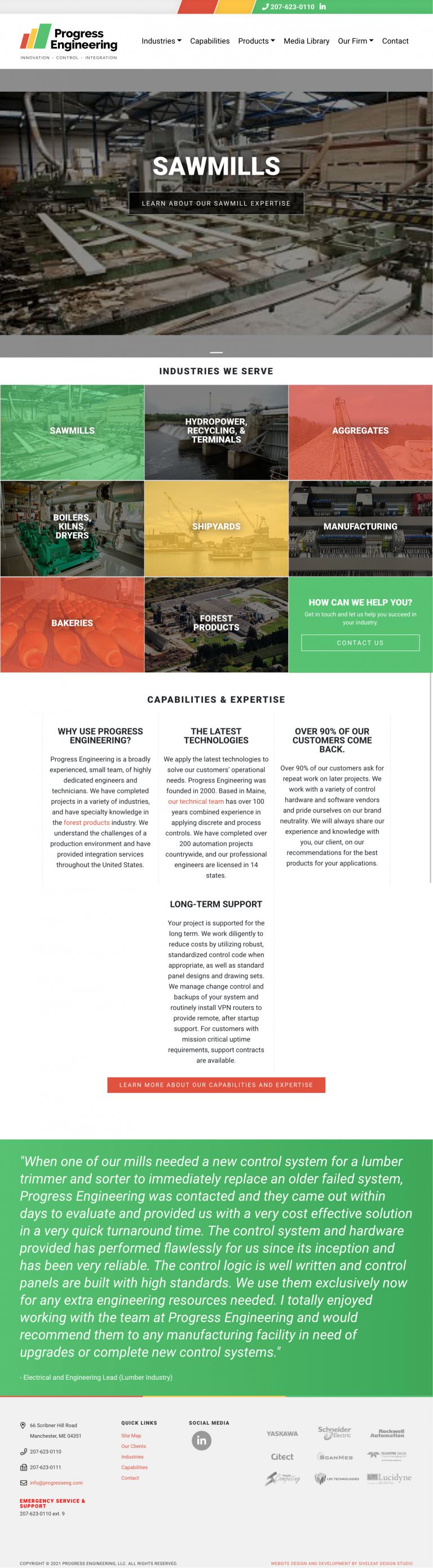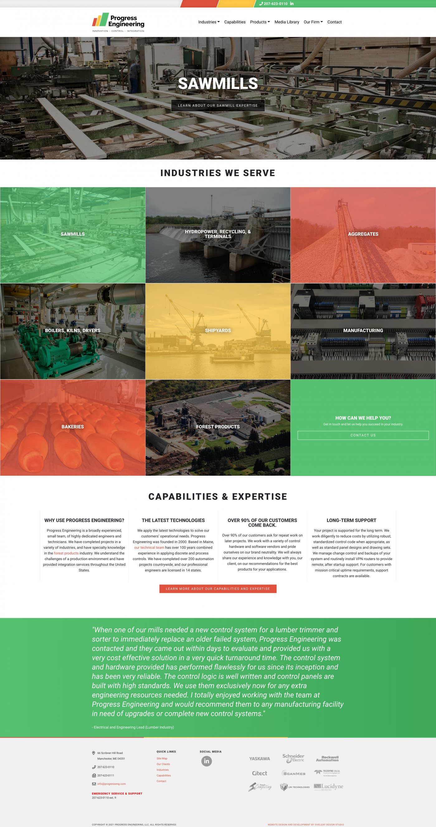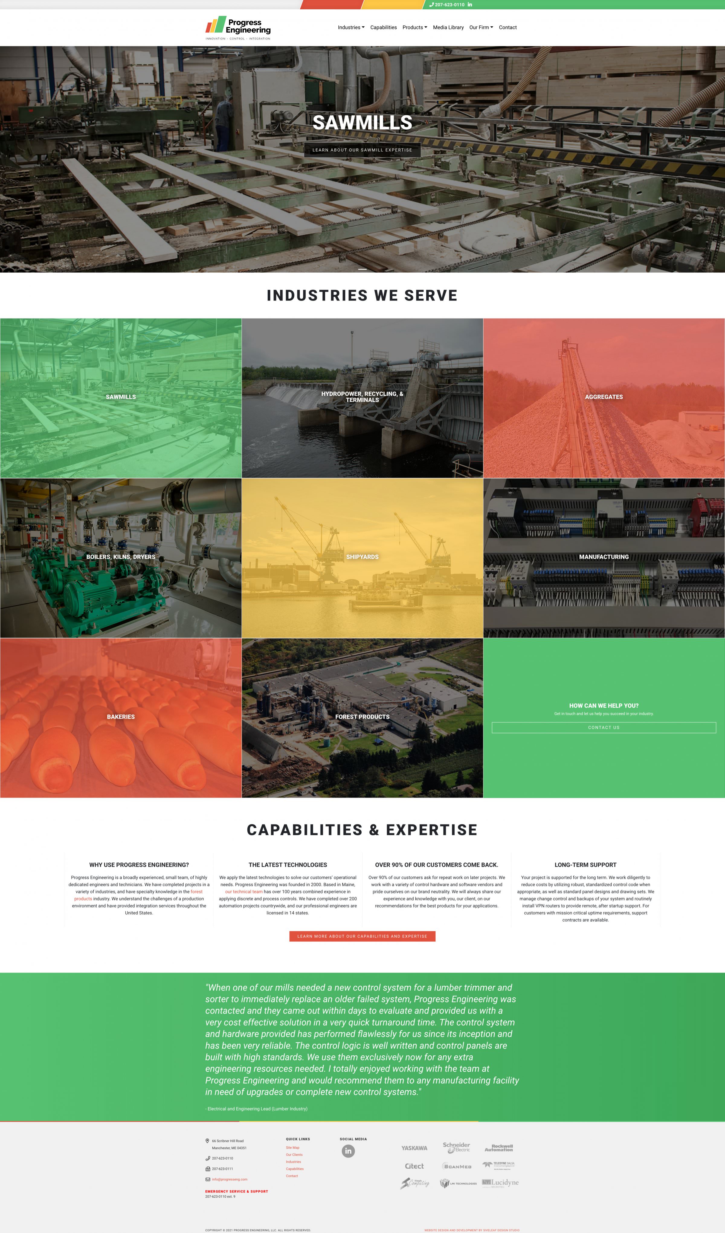 We the redesigned their website, carrying the brand colors throughout the design. Progress Engineering serves several industries, and each needed to be represented on the website. We also designed the site with expandability in mind, knowing that Progress Engineering would later want to add products and perhaps expand into new industries.